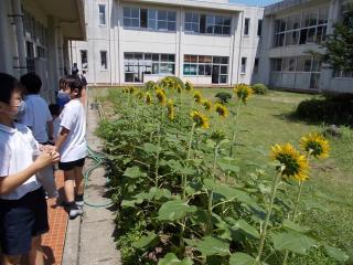 夏休み中は、中庭に3年生が育てたヒマワリがきれいな花を咲かせていました。
