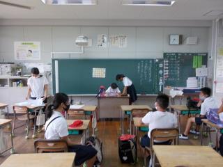 朝自習の時間を使って人吉豪雨の被害の様子や、