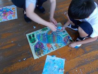 クレヨンで絵を描き、ティッシュに絵の具をつけ、