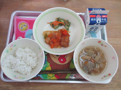 今日の給食のおかずは「けんちん汁、酢鶏、キュウリの南蛮和え」でした。どの料理にも野菜がたくさん入れて作ってありました。なんと、今日は25種類の食材が使われていたそうです。ごちそうさまでした。