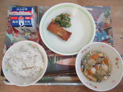 今日の給食のおかずは、「八宝菜、春巻き、かりかり和え」でした。美味しい中華メニューが並びました。かりかり和えは、歯ごたえがありました。
