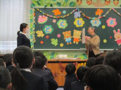 1,2,3年生には「へっこきよめさま」や「わたしは赤ねこ」など、講師の先生の語りに子どもたちは引き込まれ、笑ったりハラハラしたりほっこりしたり、お話の世界を存分に楽しみました。田中先生手作りの道具でしりとり遊びを楽しみ、言葉のリズムや声に出す楽しさを味わいました。