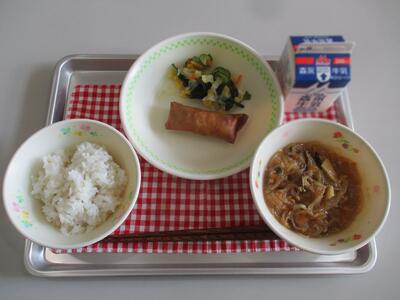 今日の給食は「マーボー春雨、中華巻き、中華サラダ」でした。炒める、煮る、揚げる調理で、香ばしくよい香りでした。中国への味の旅で、満腹になりました。