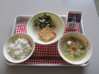 今日の給食は「白菜の味噌汁、根菜の肉詰め信田、ひじきと豆のサラダ」でした。白菜がたっぷり入った味噌汁は、っても甘くてやわらかな味でした。アツアツで届く給食。いつもありがとうございます。