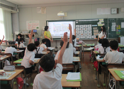 昨日、5年生の外国語の学習では、「道案内のいろいろな英語の表現を言ってみよう」というめあてを立て、教科書の中にある絵地図を使い「Go straigte!(直進)」「Turn right!(右に曲がる」)と目的地まで案内をすることで、様々な英語表現を覚えていきます。米田先生からの出題に、「はい!」と一斉に手が挙がり、正しく聴き取り正解したことを喜ぶ姿がありました。タビーナ先生と一緒に張り切っていました。