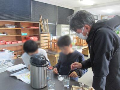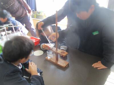 5年生たちが、真剣に説明を聞いている後ろ姿を発見。水に溶かした食塩やミョウバンの状態を調べる実験でした。あおぞら1組さんも、塩などが水にどれくらいとけるかを確かめていました。目の前で変化を見る実験は、とても面白いものです。