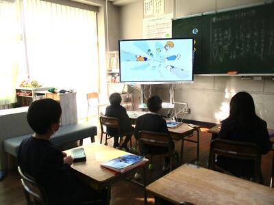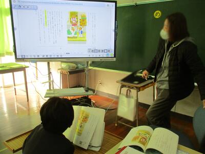 国語の時間や朝のエンジョイ・イングリッシュでは、大型の電子黒板が大活躍。画像や文字と音声で学びやすい工夫ができます。子どもたちが自分で学びとる読書の時間も、大事にしています。