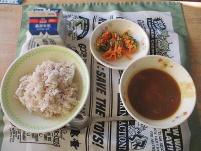 今日の給食は「雑穀ご飯、ポークカレー、キャロットサラダ」でした。子どもたちが大好きなカレー。ご飯の上にかけて、あっという間にペロリでした!ごちそうさまでした。