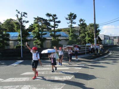 夏休み前、今日は最後の登校の日となりました。朝から強い日差しが照りつけましたが、たくさんの人が登校班のみんなとがんばって歩いてきました。お家人の見守り、地域のパトロール隊のみなさんのおかげで、事故ゼロが継続できています。毎日、本当にありがとうございました。夏休み期間中も、地域でのくらしの様子を見守っていただきますようお願いします。