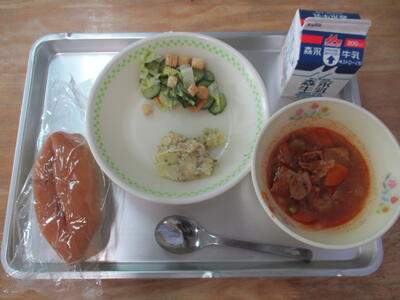今日の給食のおかずは「チリコンカン、チーズポテト、シーザーサラダ」でした。せわりコッペパンにはさんで食べることができるので、いつも以上に楽しい給食の時間でした。