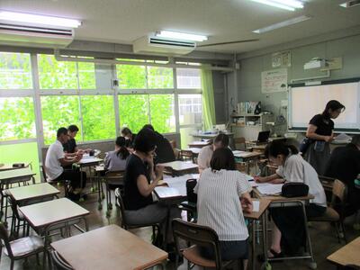 子どもたちがお互いのことを大切に思いみんなで楽しく学び合うことができるには、どのような授業づくりをしていくことが大切かについて、先生たちは研修をしました。今日は市田先生がリーダーとなって、研修を進行します。子どもたちと同じように、先生たちもお互いの意見を出して話し合うことでいろいろなアイデアが出てきて、みんなで学び合うことができました。夏休みはこうして先生たちも勉強を続けます。こつこつ、みなさんと一緒です!!