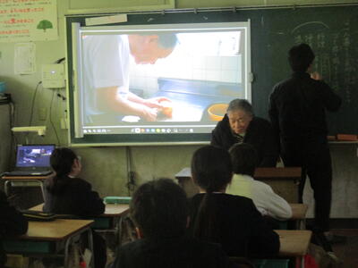 昨日に続いて、4年生は福祉の学習をしました。今日は視覚に障がいをもたれている長尾さんと社会福祉協議会の方々に来校いただきました。はじめに、長尾さんが目の病気になり少しずつ目が見えなくなったこと、盲学校で針灸師になるための勉強をしたこと、ひとり暮らしで家事を自分でしていること、ヘルパーさんに手伝ってもらうこと等を話してくださいました。家で味噌汁を作っておられる様子をうつした動画を見せてもらい、長尾さんが包丁で野菜や豆腐を切っておられる場面では「えーー!すごーい」「上手!」と歓声があがり、動画が終わると拍手がおきました。休み時間には、たくさんの子どもたちが長尾さんを取り囲み、会話を楽しんでいました。