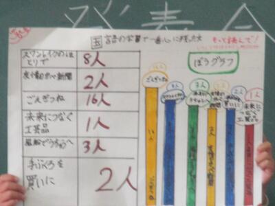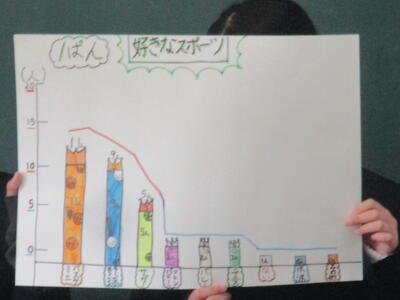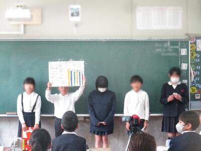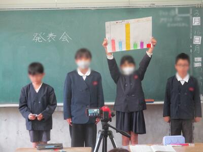 まとめ方も、棒グラフや表に表し、色遣いも工夫することで、見る人にわかりやすく伝えることができます。なんといっても、各班ごとに繰り返し練習をして、一人一人が役割を果たしていたこと、後ろの人にも届く大きな声で発表できたことが素晴らしかったです。教頭先生にもたくさんほめてもらって嬉しそうでした。意欲満々の姿が、さすがでした!