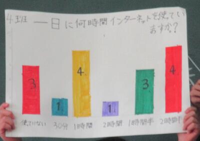 1好きなスポーツ、2国語の学習で1番心に残った文、3日曜日の過ごし方、4一日に何時間インターネットを使っているか、5五日間にどのくらい図書室に行くか、6好きな給食のメニュー、7好きな教科、8金曜日は何をしているか です。身近な生活の中から、興味深いテーマを考えるものですね。
