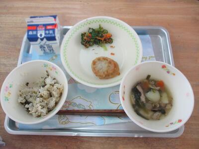 今日の給食は「高菜飯、だご汁、レンコンはさみ揚げ、おかか和え」。もうお分かりですね、今日は「ふるさとくまさんデー」阿蘇地方の郷土料理でした。今年は暖冬だったせいか高菜の生長がはやく、新高菜漬けが商店に並び始めたそうですよ。