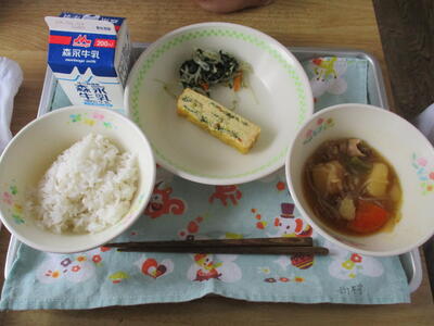 今日の給食のおかずは「肉じゃが、千草焼き、ほうれん草のおひたし」でした。ほくほくのジャガイモがおいしかったですね。
