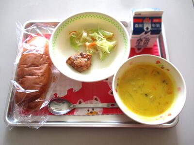 今日の給食は「ミルクパン、かぼちゃのポタージュスープ、鶏のマーマレード焼き、キャベツのサラダ」でした。かぼちゃがごろごろ入った濃厚なスープに仕上げてありました。寒い冬にぴったり!甘くておいしかったです。
