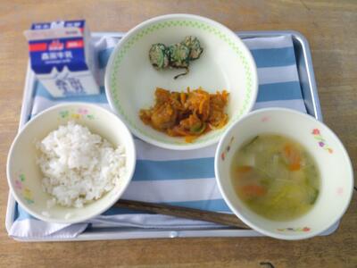 今日の給食は「白菜の味噌汁、白身魚の甘酢あんかけ、胡麻きゅうり」でした。冬野菜の代表「白菜」が入った味噌汁でした。味噌汁に入れることで、野菜がたっぷりとれますね。