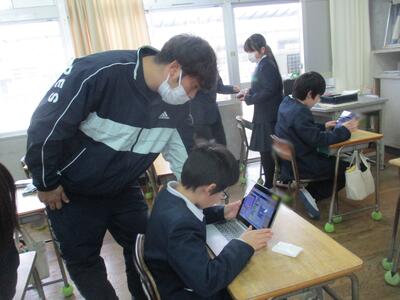 5校時終了のチャイムが鳴り休み時間の様子を見に行くと、5年教室ではタブレットに集中している人が多数。ICT支援員の鹿島先生に教えてもらったプログラミングで様々にトライを続けているところでした。ワイワイ友達や先生と話し合いながらトライする人、自分の力でトライし続ける人。一人一台あることで、自分のペースで学び続けることができます。ファイト!5年生