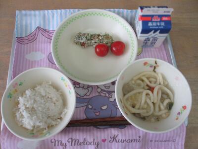 今日の給食は「さぬきうどん、ちくわの磯部揚げ、ミニトマト」でした。あおさをつけて揚げてあるので、風味豊かな磯部揚げでした。あと1つ食べたくなりました。