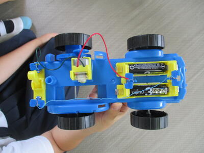 4年生教室につながる廊下では歓声が聞こえてきました。子どもたちが理科の実験の真最中。「電流のはたらき」の学習で、2個の乾電池を直列につないだ場合と、並列につないだ場合で、車のスピードがどのように変化をするかを調べる実験です。直列つなぎにしてパワーアップを図るか、並列つなぎにして長く走らせるか。・・・。友だちが作った車とレースをすることもできて、みんなで楽しみながら学んでいました。