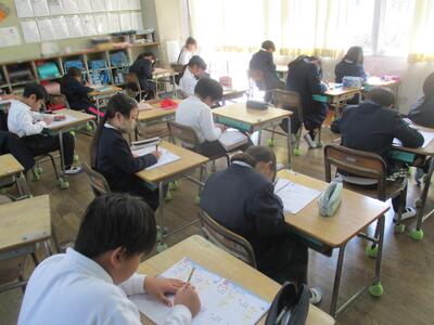 修了式・卒業式まで、のこり数日となりました。どの学年も、まとめのテストやドリルの仕上げを黙々と取り組んでいて、ラストスパートです。嬉しいことに、ここ数日は欠席する人もぐんと少なくなりました。朝晩は冷えますので、この土日も体調管理をしっかりとしてください。最後には、お楽しみ会を計画している学年もあるようです。みんなで仕上げの学習を進めていきたいと思います。