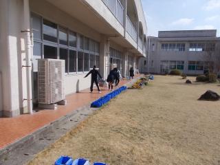 掃除の後に1年生が卒業式用の花のお世話を頑張っていました。