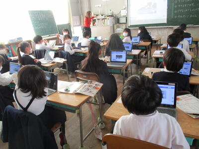 4年生たちは、国語「世界にほこる和紙」の学習経験を生かし、自分が紹介したい伝統工芸のよさを説明するために、理由や例をどのように示すかを考え、文章を組み立てていきます。タブレットで文章を書き、写真も取り込んでリーフレットに仕上げていきます。本や資料をじっくり読み込み、キーボードを打つ姿。子どもたちの吸収力はすばらしいです。