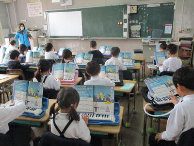 「ドド ソソ ララ ソー♪」で始まる「きらきら星」を1年生が鍵盤ハーモニカで演奏していました。同じ音を2回ずつ、最後は2拍、リズムにのって演奏します。1本の指で弾いている人、2本の指で弾いている人、なかには、両手で弾いている人もいいました。できることがどんどん増える1年生たちです。