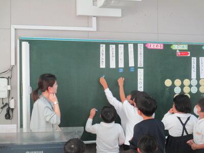午後からは、1年生の学級会の様子を先生たちに見せてもらい学ぶ研究授業でした。係の人の号令でチャイムと同時に授業が始まり、みんなでアイデアを出し合って作った「クラスの歌」で、元気いっぱいに話合いがスタートしました。司会グループの4人の人たちで進行をしながら、みんながもっと仲良くなれるように「きらきらお楽しみ会を開こう」という議題で、何をするか、誰がどんな係をするかを話し合いました。1年生たちは、「わたしは〇〇に賛成です。わけは、・・・だからです。」としっかりと意見を言うことができました。また、司会進行も上手にできていました。