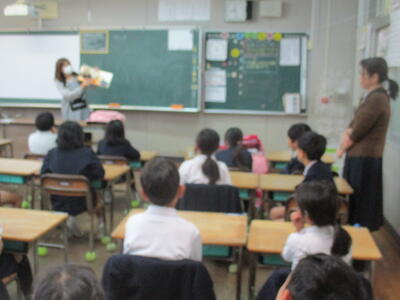 新型コロナ感染症の流行でストップしていた「読書まつり」。読書部のみなさんに準備を進めていただき、横島の学童の先生である田中先生と本校の小北先生を読み聞かせの講師に迎え開催しました。講師の先生方は、これまでのPTA読み聞かせでどんな本が読まれているかを確かめ、どの本にするかお二人で相談と練習を重ね本日を迎えられました。