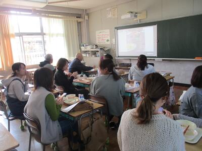 その後、給食の準備、試食、片付けまでを体験されました。「おいしい!」と近くの方との会話も弾み、楽しい試食の時間となりました。これからも、時々お子さんと給食のことをお話しなさってみてください。PTA家庭教育部の皆さん、大変お世話になりました。