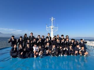 フェリーの屋上でみんなで記念写真です。