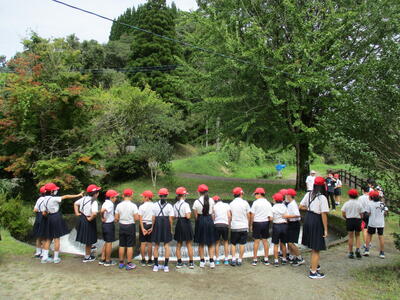 次は、円形分水の見学です。笹原川の水を周辺地区に公平に流れるように造られたものです。みんなのくらしが良くなるようにと、豊かな水を分かち合う地域の人々の思いや願いが伝わりました。