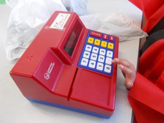 お店形式で、事前におもちゃのお金を配り、それを使って先生方が買い物をします。