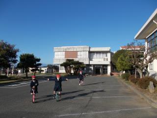 一輪車で遊んでいる子どもたちの後ろに