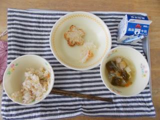 ・鶏ごぼう汁 ・麦ご飯 ・牛乳 ・鯖のおろしソース