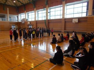 6年生が体育館で待機し、各学年が6年の所に行き