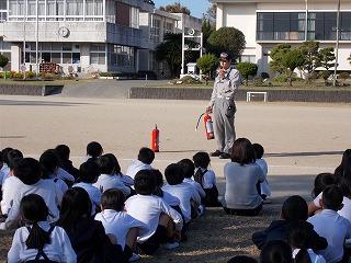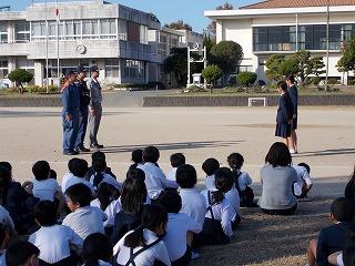 運動場へ避難をした後、消防署から消防士の方々にきていただき、お話をいただきました。