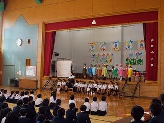 最初の発表は、3,4年生合同で合唱「にじ」と合奏「宇宙戦艦ヤマト」を発表しました。迫力のある発表で、中学年の子どもたちの団結を感じました。