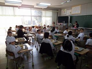 給食では、1年生が栄養職員の先生と一緒に食べました。モリモリ食べる1年生の姿に、先生も喜んでいらっしゃいました。