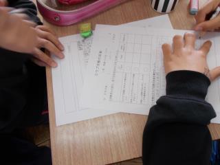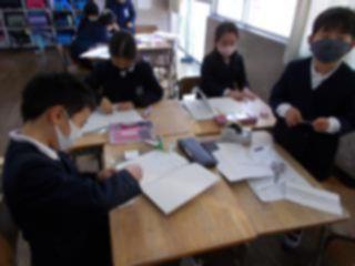 2年生が「箱の形を調べよう」の学習で箱作りをしていました。