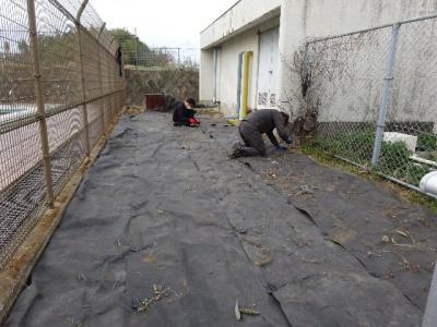 プールとポンプ小屋の間を防草シートで覆ってくださいました。