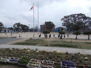 校庭には梅の花が咲き