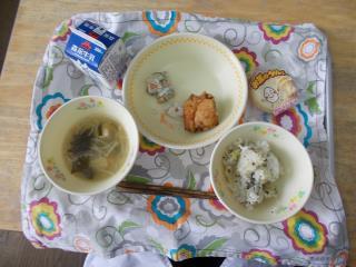 ・わかめスープ ・サツマイモご飯 ・からあげ ・れんこんサラダ