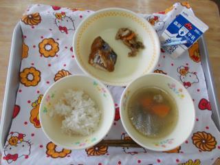 ・鶏ごぼう汁 ・麦ご飯 ・牛乳 ・鯖のおろしソース
