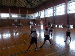換気や友だちとの距離に気をつけながら準備運動を行っています。