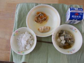 ・わかめスープ ・餃子 ・豚肉のキムチ炒め ・牛乳 ・麦ごはん