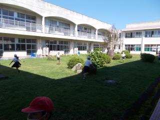 久しぶりの昼休み、3年生の子どもたちが中庭で