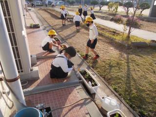 1年生が昨日植えたパンジーの花の水やりを頑張っていました。
